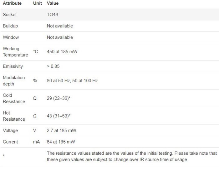 Key features for all Axetris infrared sources; True black body radiation (2 to 14 μm). High emissivity. Fast electrical modulation (no chopper wheel required). High modulation depth. Energy efficient (excellent optical output). Superior lifetime.