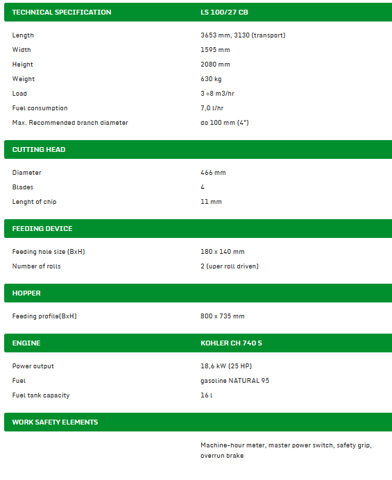 The chipper LS 100/27 CB is designed for disposal of wood waste, twigs, bark, branch-wood and other above-ground biomass. It can dispose all these materials with diameters up to 100 mm. The chipper is also equipped with a loading roll hydraulically controlled and linked to an automatic system as overload protection of its combustion engine. Furthermore, standard equipment comprises also hour counter (daily/total), turnable and tiltable discharge duct and air-cooled 25 HP Kohler engine. This chipper assembly, completed also with an overrun brake, can be coupled to towing vehicles (even passenger cars). For such a road train up to 3,5 t the driver should keep a driving licence at least of the group B.