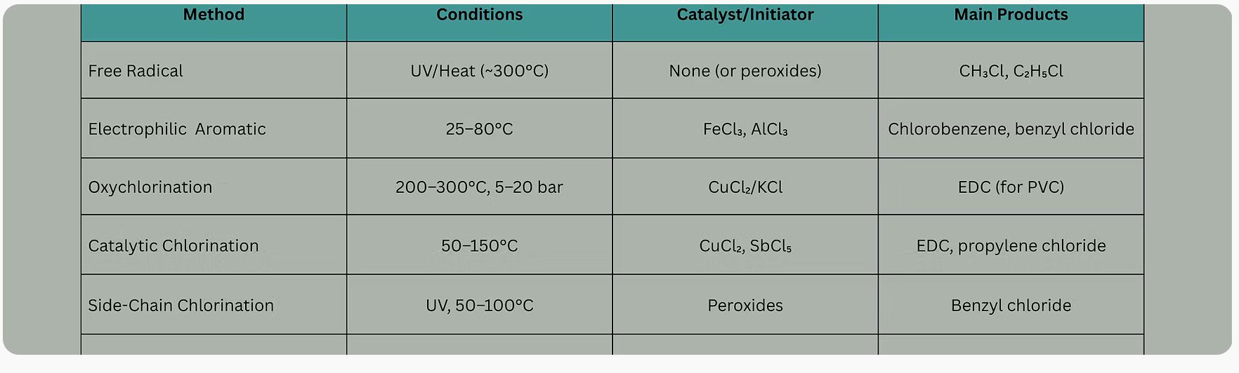 Applications: Production of vinyl chloride (PVC) and hydrochloric acid.
