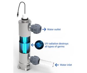 - Curative solution: As the water passes through the UV steriliser, the lamps generate ultraviolet rays which destroy living cells (bacteria, viruses, algae, etc.), without modifying the physico-chemical criteria and without generating by-products harmful to health and the environment.