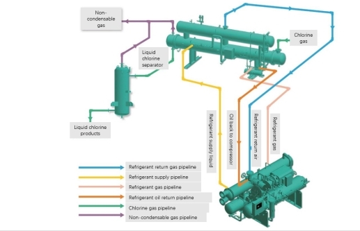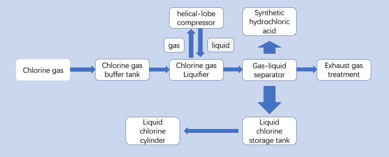 The chlorine gas liquefaction device is composed of a chlorine gas liquefier, an oil return device, and a liquid chlorine separator. The chlorine gas collected in the chlorine gas buffer tank is purified, liquefied, and then separated through a chlorine gas liquefier and helical-lobe compressor. Store liquid chlorine in storage tanks for subsequent injection into steel cylinders.