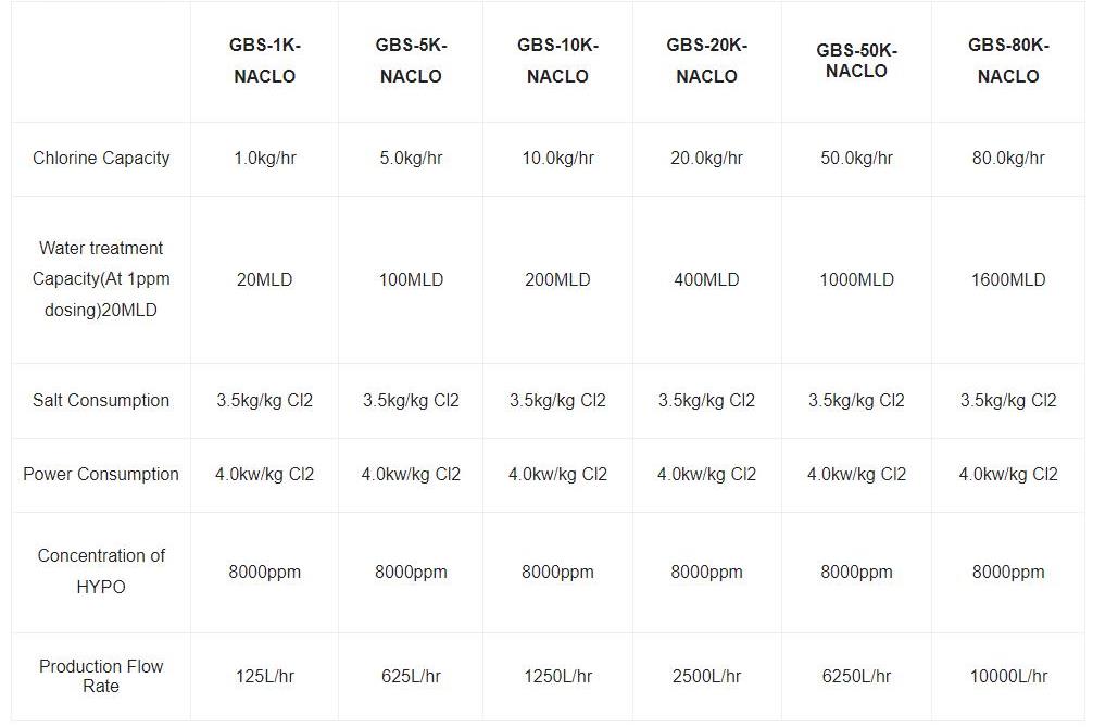 Chlorine Capacity: 1~80kg/h. Water treatment Capacity: 20~1000 MLD. Salt consumption: 3.5kg/kg Cl2. Power consumption: 4kw/kg Cl2. Plug-Play & Minimal Installation Operation. Fully Automatic Running. Enhanced Electrode Protection for Longer Shelf life. Triple Protection for Hydrogen gas emission.