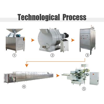 The automatic chocolate production line uses cocoa powder and cocoa butter as raw materials to produce chocolate in large quantities. The processing line mainly includes the steps of mixing, fine grinding, temperature adjustment, forming, and packaging. The chocolate-making machines provided by Taizy have high automation, large production output, and a wide range of applications. The automatic chocolate production line can produce chocolates of different shapes by changing different molding machines.Therefore,this industrial chocolate processing plant is suitable for making chocolate bars, chocolate chips, coin chocolate, chocolate bean, and other shapes of chocolate.