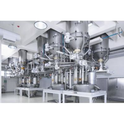 The AZO COMPONENTER® in circular design is recommended when a small number of components need to be automatically weighed. Following this principle the surge bins, such as feeding hoppers for sacks, pneumatically fed receivers or small silos are arranged in a circle above the collection vessel. They can be fed by vacuum or pressure conveying. Each component has its own discharge, dosing and scale optimised to the specific raw material. Thus, parallel weighing processes and feeding of several mixing lines are possible. The AZO vibration bottom employed here ensures reliable transfer even for small components with poor flowing characteristics. The vibration dosing screw with locking device guarantees highly accurate dosing.
