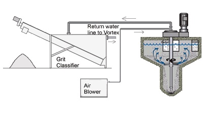 The Vortex Grit Trap is used to screen and wash sand present in water. Water flows into a concrete circular tank with a cone-shaped bottom where some rotating paddles move the sewage continuously. The particular movement induced by the mechanical action of paddles cause a secondary transversal current meeting the main current of sewage, helps in accumulation of sand in the bottom side of cone. Sand accumulated in the cone bottom is sucked up by an hydro extracting pipe. The clarified water flows out from the exit situated in the top of tank.