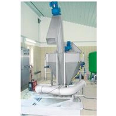 The grit/liquid mixture is fed tangentially into the circular grit chamber and after an orbit of approximately 300° flows into the outlet of the washing tank via an overflow weir. In the course of this circular movement, the grit sinks to the bottom of the washing tank by gravity.