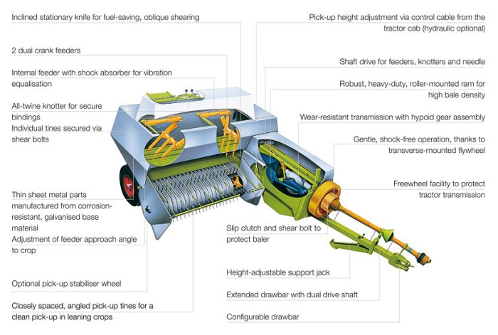 The long bale chamber produces uniform, highly compact, sharp-edged bales. The binding twine is run through deep grooves indented in the bales by angular rails to prevent sideways slippage and maintain the structure and composition of bales when handled roughly by the bale ejector or other conveying equipment.