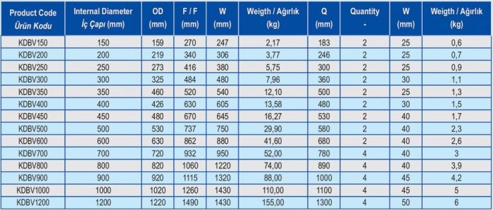 Product Code : KDBV150. Internal Diameter mm : 150. OD mm : 159. F/F mm : 270. W : 247. Weigth/Agirlik : 2,17. Q mm : 183. Quantity : 2. W mm : 25. Weigth/Agirlik : 0,6.