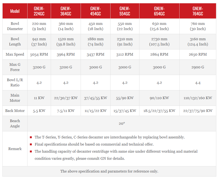 GN Clarifying Decanter Centrifuge is C series decanter centrifuge with beach angle of 20 degree. GN Clarifying Decanter Centrifuges are designed for the continuous separation of suspensions into solids and clarified liquid, without interrupting the feed of the suspension. It suits for material of small particle size, low density difference between solids and liquid, moderate viscosity, moderate concentration.