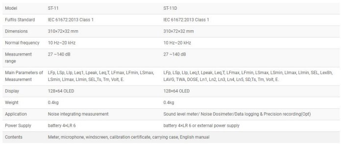 Class 1 Complies with IEC-61672-2013. 10 Hz-20k Hz frequency range. 27 dB-140 dB measurement range. Data logging & record function (St-11D). Measures and displays Leq value. Long term measurement.