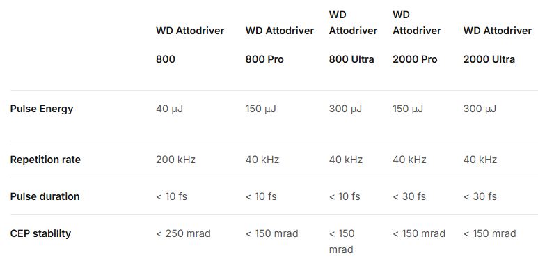 The White Dwarf Attodriver is designed for attosecond science and efficient XUV generation enabled by carrier-envelope phase (CEP) stable few-cycle pulses on a compact footprint.