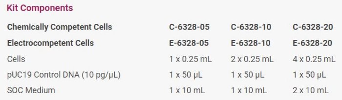 Transformation efficiency is tested using pUC19 control DNA, performed in duplicate. Transformed cells are plated on LB agar containing 50 μg/mL carbenicillin. Transformation efficiency is ≥ 1 x 108 cfu/μg DNA.