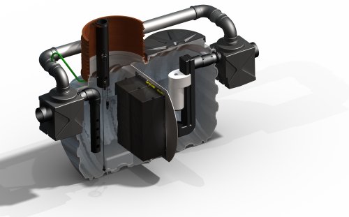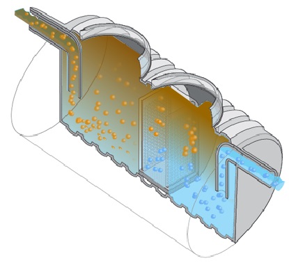 - Contaminated water enters the separator. Due to the patented Pipelife water distribution system, the water and oil are evenly distributed. The larger oil drops will rise to the water surface due to their low density.