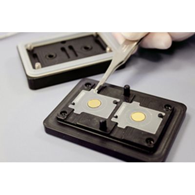 Highly chemically compatible, the cleaning unit is the best choice for cleaning and coating of quartz chips. The cleaning unit is very practical for cleaning and coating of the quartz chips’ surface. When loaded, only the upper electrodes of the quartz are exposed to the outside so that the whole unit can be totally immersed in fluids, e.g. ultrasonic bath. The material of the cleaning unit ensures a high chemical resistance against hazardous fluids. The standard cleaning unit can operate with two chips at the same time.
