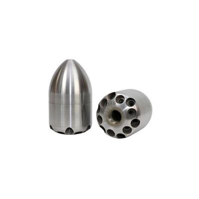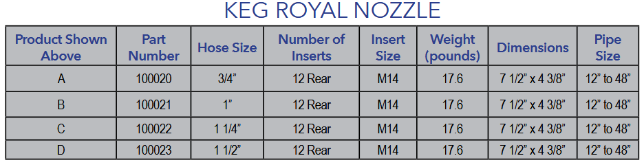 The Royal Nozzle, because of its wider angles, is more diverse, because it allows more penetrating power to clean pipes better than other nozzles. With 12 alternating jets at 22° and 32°, the Royal Nozzle is designed for all-around cleaning of pipes up to 48” in diameter. The sheer weight of the Royal Nozzle keeps it on the bottom of the pipe for effective cleaning when other nozzles are flailing about wasting water. The 12 insert set-up can be configured in steel or titanium ceramic. The Royal is a Tier Three Nozzle, features KEG’s Highest Performing Fluid Mechanics, and is over 95% efficient!