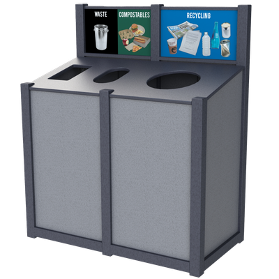 Designed to be simple yet durable, this economical unit includes a high visibility graphic backboard, a hinged lid and unique bag clips to hold bags firmly in place for easier servicing. Suited for indoor or outdoor applications and is available with either one or two streams per compartment. Available with multiple opening and color options.