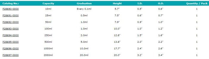 Clear TPX® (polymethylpentene) plastic cylinders are non-wetting to prevent a concave meniscus, making the raised numeral, single scale graduations easy to read. Shatter-proof. Wide octagonal base prevents tipping and rolling. Superior chemical resistance. Safe for use to 175ºC (350ºF); steam autoclavable at 121ºC (250ºF). Made of TPX® Brand PMP for easy viewing.