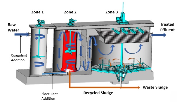 • Zone 1—Rapid Mix, Complete Coagulant dispersion ensures total charge neutralization.