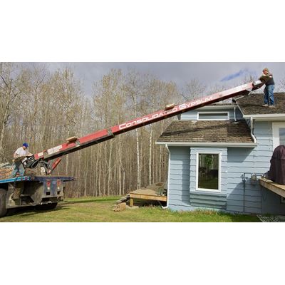 Cleasby Conveyors are all of heavy duty construction, totally hydraulic and extremely versatile. The conveyors come equipped with a heavy duty belt, especially suited for moving tiles and other materials to the roof. The belts have 4" high dual cleats and are used by roofers and supply houses to make roof-top deliveries of tiles, shingles, plywood, deck slabs, felt, insulation and sheet rock. These units have four hydraulic functions; forward and reverse, a full 360° rotation at a controlled speed of 1/2 rpm, boom elevation to a 70° angle and a raised turntable post from 2-1/2` for waist high roof loading to a 7-1/2`; load clearance level with other options in between.