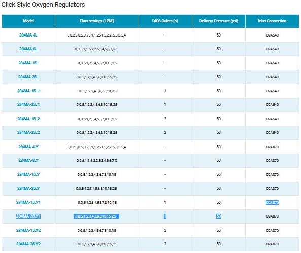 GENTEC click-style oxygen regulators are available in standard and mini versions, with flow rates of 0-8 LPM, 0-15 LPM, and 0-25 LPM. CGA 540 and CGA 870 inlet connections are available.
