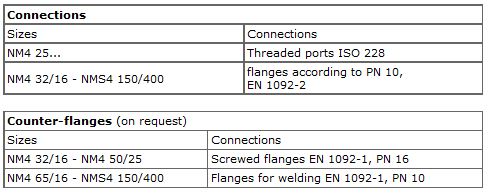 Close-coupled centrifugal pumps; electric motor with extended shaft directly connected to the pump up to 30 kW, new bracket construction for standard motors (stub-shaft construction) from 37 to 75 kW with integrated thrust bearing. Pump casing with axial suction and radial delivery on top, main dimensions and performance according to EN 733. NM(S): version with pump casing and lanter bracket in cast iron. B-NM(S): version with pump casing and lanter bracket/casing cover in bronze. (the pumps are supplied fully painted).