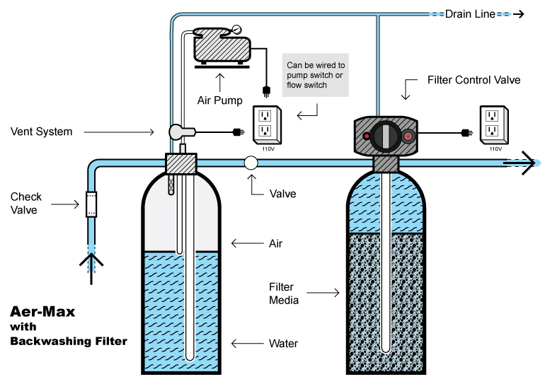 Whether iron, manganese, or hydrogen sulfide is being treated, the Aer-Max unit must be followed by a filter to remove the oxidized contaminants. When treating hydrogen sulfide alone, either a backwashing filter or a cartridge style carbon block filter will work, but with iron and manganese, a backwashing filter is normally used because filter cartridges will clog and need frequent replacement.