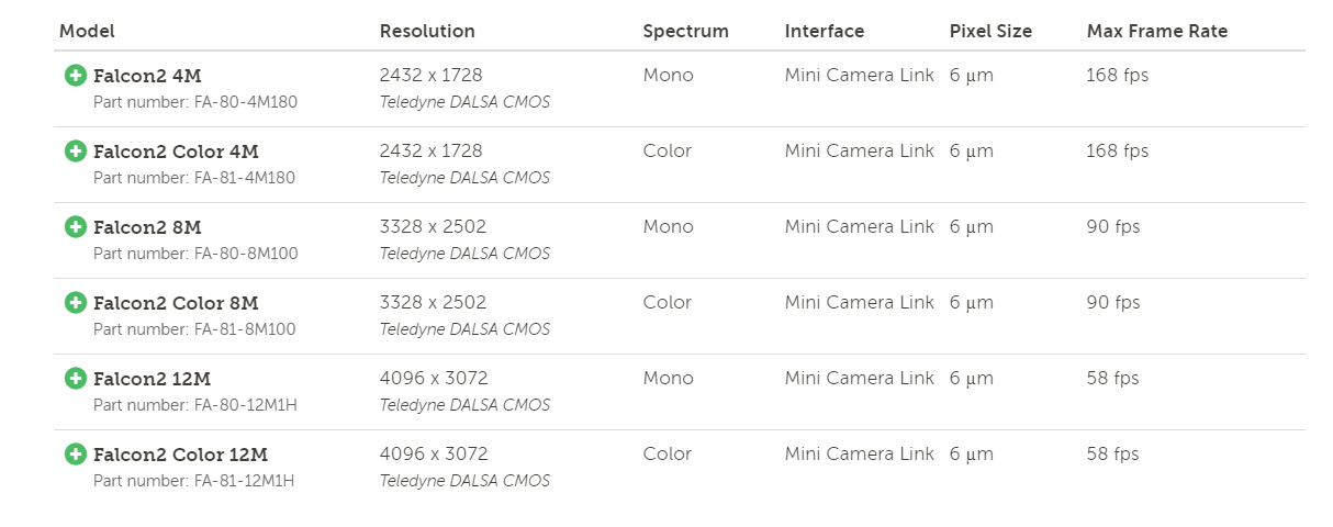 The Falcon2 series is Teledyne DALSA`s latest high-performance area camera family. Featuring our latest CMOS technology for high speed, high resolution imaging with true global shutter operation, the Falcon2 cameras deliver high quality images of fast-moving objects without smear or distortion.Teledyne DALSA`s Falcon2 cameras also provide an extensive feature set including programmable exposure time via Camera Link interface or additionally by external hardware signals, and selectable aspect ratios (4:3 and 1:1). Wrapped in a remarkably compact, rugged, thermally efficient body that has been optimized for industrial applications, the Falcon2 cameras deliver outstanding performance and value.