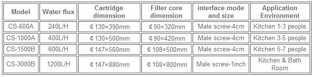 CS Series UF Household Filter The filter cartridge is made of hygiene grad Stainless Steel with working life more than 8 years, filter core is made of food grade PAN hollow fiber membrane with working life more than 3 years.