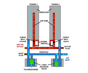The dry air exits the machine via an outlet filter and regulator. A small amount of dry air is used to prepare the second scrubber tower for use. The unit switches which scrubber tower is being used at regular intervals.