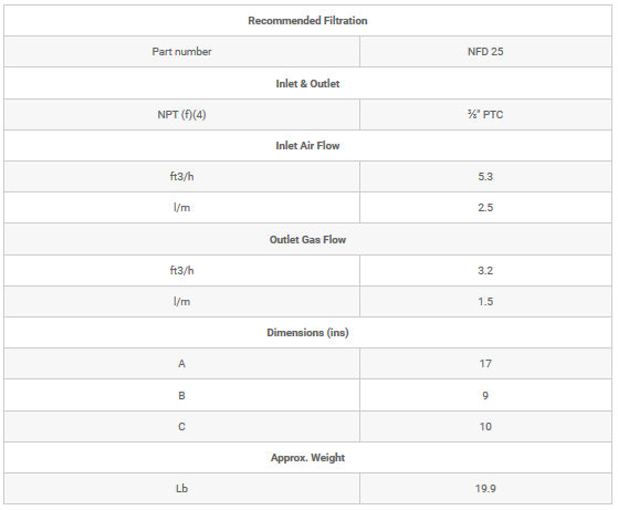 Design operating pressure range: 58 to 174 psig. Recommended operating temperature range: 59 to 68°F. Power supply requirements: 50 or 60 Hz, 100 to 240 VAC. Maximum noise level (during depressurization): 60 dBa. Manufacturing quality standards: ISO 9001.2015 & CE.