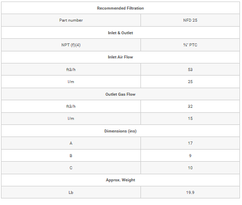 Design operating pressure range: 58 to 174 psig. Recommended operating temperature range: 59 to 68°F. Power supply requirements: 50 or 60 Hz, 100 to 240 VAC. Maximum noise level (during depressurization): 60 dBa. Manufacturing quality standards: ISO 9001.2015 & CE.