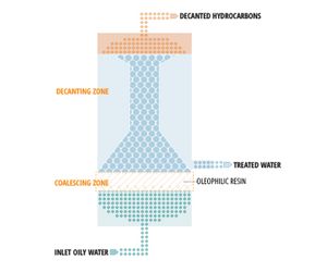 The hydrocarbons are initially absorbed, building up a film on the resins surface, then start being released in form of larger drops. The film is continuously removed and therefore the process can be considered as self-regenerating. The coalescing filter is the most suitable process for these type of effluents for the following main reasons: