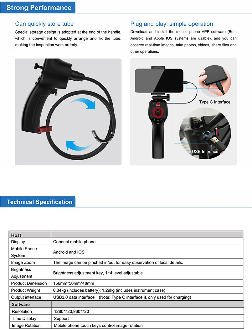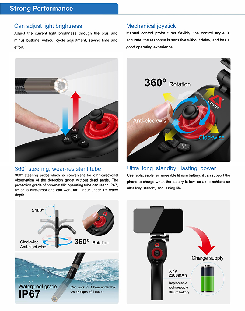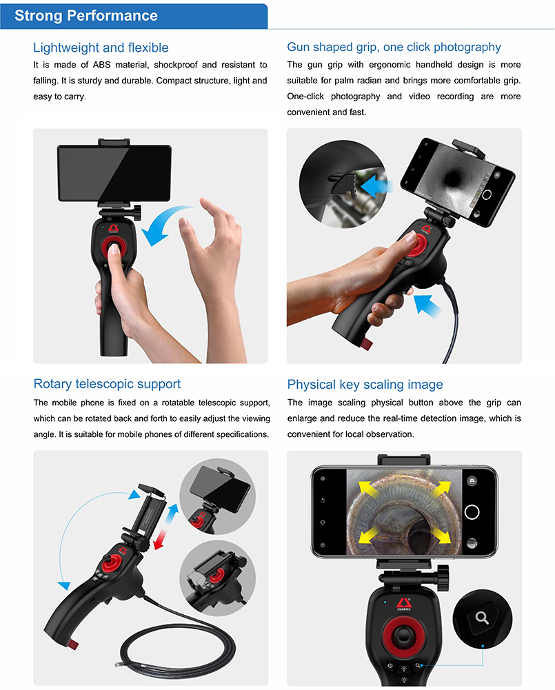 X1 series is a new product that combines industrial borescope with mobile phone to realize image inspection. It uses mechanical joystick to control the 360 ° rotation of the probe. Users can observe the internal situation of the object in real time through the mobile phone, and can take photos and videos with one click, can view and share pictures and video files. It is convenient to use and easy to operate, applicable to various scenarios such as vehicle maintenance, sewer inspection, home appliance maintenance, industrial inspection, etc.