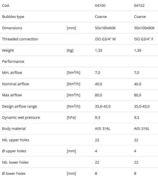 AISI316L coarse bubble diffuser available with ISO G 3/4″ M or ISO G 3/4″ F threaded connection. Commonly used in sand and grease removal channels.