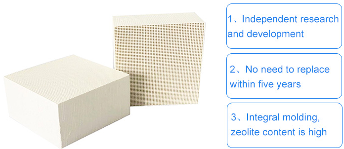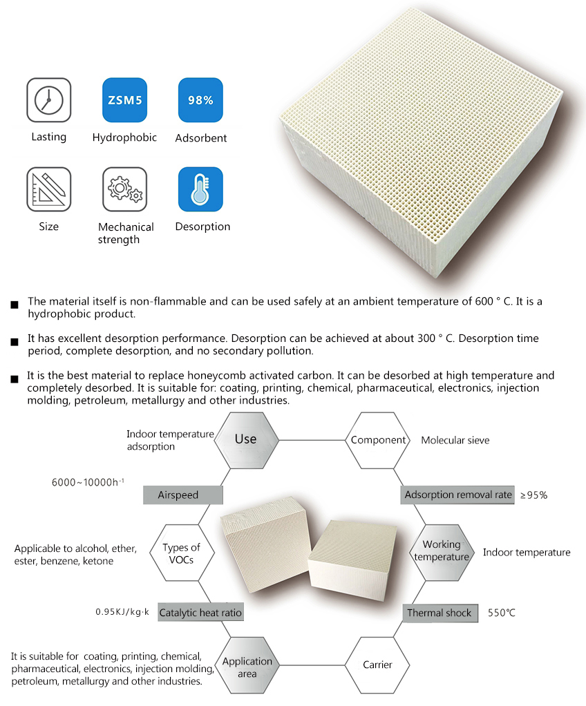 It was prepared by using honeycomb ceramics and molecular sieve coating materials as carriers. The coated honeycomb zeolite has good hydrophobic properties, the single-stage adsorption efficiency can reach 90-98%. It still has a strong adsorption capacity at higher temperatures.