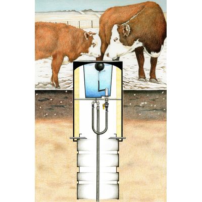 The Model LB with Floatless Valve System features unmatched winter endurance for two to three head access. The entire tub of water is constantly and directly warmed by the wide column of ground heat that prevents freezing of the valve and plumbing, even with zero traffic. Cleaning is easy — lift out the tub, swirl the water and empty it out. The more complex and sensitive floatless valve (not made by Cobett) requires a strainer, even for city water. A diaphragm that senses the water weight activates this valve. The floatless valve water level may vary 1″ to 2″ from day to day due to changes in the atmospheric and/or water pressure. The floatless valve comes with a tool to set the water level.