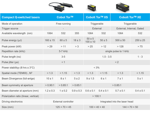 The Cobolt Tor™ Series lasers are high performance Q-switched diode pumped lasers. The sophisticated cavity design of these lasers provides a unique combination of high pulse repetition rates, short pulse lengths and exceptional pulse-to-pulse stability in a high quality TEM00 beam.