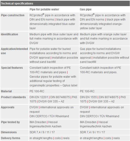 RCprotect pipes are coextruded solid pipes made of PE 100-RC (Resistance to Crack) with dimensionally integrated colored outer layer.