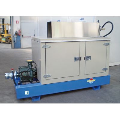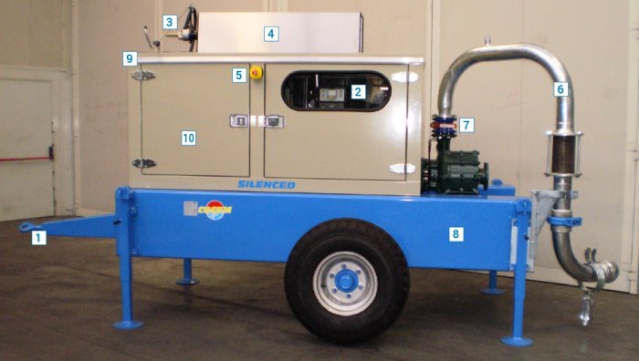 Drawbar, Elcos 250 control panel, rope-winch, exhaust, emergency stop switch, fixed gooseneck, gate-valve, tank trailer, sound proof-case, side doors, crane for suction-pipe lifting.