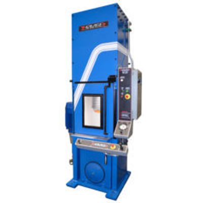 These cold header die repair presses are used in the bolt-making industry to press carbide inserts into and out of cold header dies. The presses are enclosed on all sides to withstand the occasional breakage of brittle carbide die, and the access door features a ballistics-rated Lexan window for easy viewing and increased operator safety.