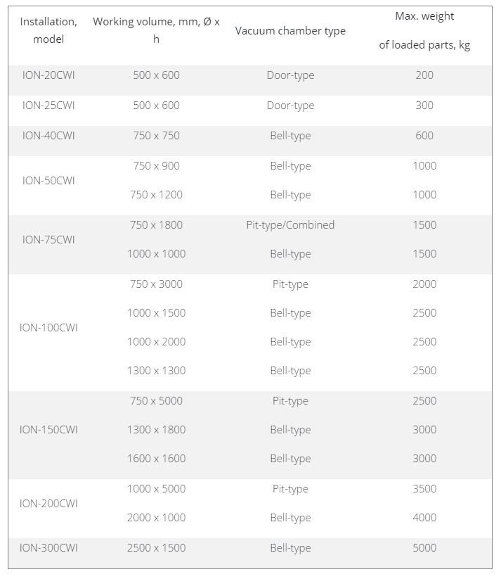 The heating of the parts, in a Cold-Wall plasma nitriding installation, is carried out only by pulsed plasma created in the vacuum chamber. This type of plasma nitriding equipment is especially suitable for nitriding similar in shape and size batches of parts. The main advantages of this type of equipment are:
