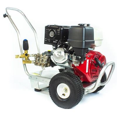 Introducing an original Dirt Monkee by Dirt Killer. Boasting a powerful impact of 3000 PSI (pounds per square inch) with the full tested force of 5.3 GPM (gallons per minute) this machine is ready to work. Powered by a Honda GX390 pull start engine paired with a direct drive General Pump (GP) ESN1512G model with an external unloader, this unit is perfect for mobile commercial use. Resting on aircraft grade aluminum trolley cart frame, with dedicated lance, hose and nozzle holders this Dirt Monkee is ready to get to work.