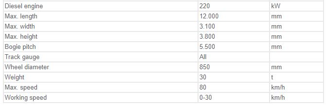 The machine can be made available for all rail gauges. The BALLAST REGULATOR BPM220 consists of Electro-welded steel structure frame. N.2 drive axles. Chevron-type suspension or laminated suspension spring. Hydrostatic drive with closed circuit. No.2 bi-directional central ploughs. No.2 side ploughs for track bench profiling. No.1 brush for excess ballast removal. Direct and indirect braking system. Parking brake, Tristop negative. Control and drive electric system. Lighting system for night work. Acoustic signaling. Soundproof, air conditioned and pressurized cabin.
