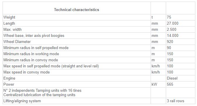 Levelling, Lifting, Lining and Tamping Machine for Plain Track. Structure: Frame made of sturdy electro-welded girders. Two bogies, two motorized axles. Pneumatic brakes. 4 locking devices for the axle suspensions. Continuous and automatic UIC brake. Two emergency braking valves. Direct brake. Parking brake.