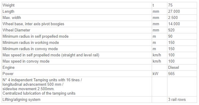 Levelling, Lifting, Lining and Tamping Machine for Plain Track and Turnouts. Structure: Frame made of sturdy electro-welded girders. Two bogies, two motorized axles. Pneumatic brakes. 4 locking devices for the axle suspensions. Continuous and automatic UIC brake. Two emergency braking valves. Direct brake. Parking brake.