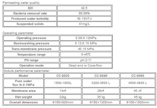 CC-60 Series column type ultrafitration module is mainly applied to small scale ultrafiltration system or mobile emergency equipment, with membrane material basically comprised of PAN, is widely used in feed water purification, producing water is above Standard of GB5749-2006《Quality and Hygiene standards of the State for Drinking water》. This type of membrane module is partially made of PVDF material and mainly used for reclaimed water reuse.
