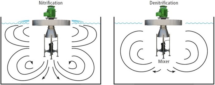 - Combination aeration / mixing: due to the dual function, the combination unit can be used for intermittent nitrification / denitrification and in SBR systems