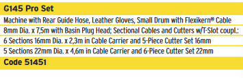 Here’s a sectional cable machine that drives 22 and 16mm Dia. Sectional Cables -or even 7, 8 or 10mm Dia. Flexikern®Cables for small drain work. You switch from22 to 16mm and back by repositioning the chuck cone. No adapter required.Attach a small drum to the back of the machine to drive smaller cables. The G145gives power and convenience. The motor is a 1/3 hp capacitor type, so it deliversplenty of torque to the cables. Yet, as soon as you lift the drive handle, the cablestops rotating, so there is no additional torque build up. You also use the drivehandle to carry the machine. And when it’s in position on the job, its four pointbase gives it rock-solid stability. A cutter holder is attached to the back of theG145, so your cutting heads are always with the machine.
