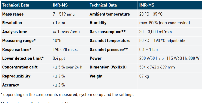 The CombiSense is a combination of an Electron Impact (EI-MS) and an Ion-Molecule Reaction (IMR-MS) mass spectrometer in one analyzer unit for a broad range of applications. This enables you to measure the main components in the volume percent range simultaneously with trace gases in the ppm and ppb level.