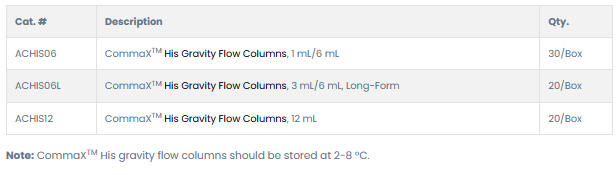 CommaX His gravity flow columns are packed with highly cross-linked Poly (methyl methacrylate) beads which are coated with a propriety hydrophilic layer, then grafted with IDA ligands which donate binding sites to Ni2+ ions, forming an immobilized metal affinity chromatography (IMAC) medium for purifying recombinant proteins with poly-histidine tags.